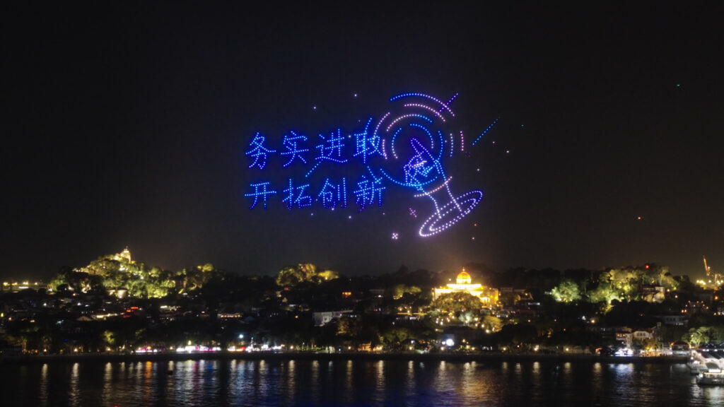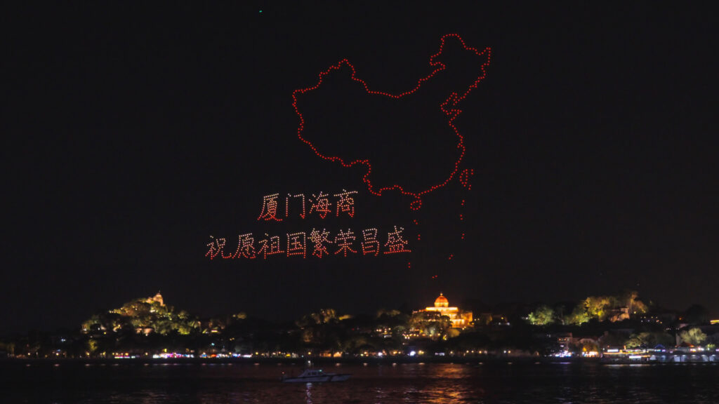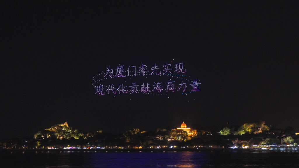 而当夜的帷幕被科技彻底点亮,庆典迎来了载入史册的震撼高潮。商会特设千架无人机表演,在鼓浪屿的夜空之上,为十周年华诞书写下最辉煌的注脚。千架无人机如璀璨星河,翩然升起,以天为幕,以光为笔。它们瞬息万变,精准构型:从“海上升明月,天涯共此时”,到代表厦门经济特区振翅高飞的白鹭,一幅幅壮丽的奋斗画卷在苍穹之上徐徐展开。