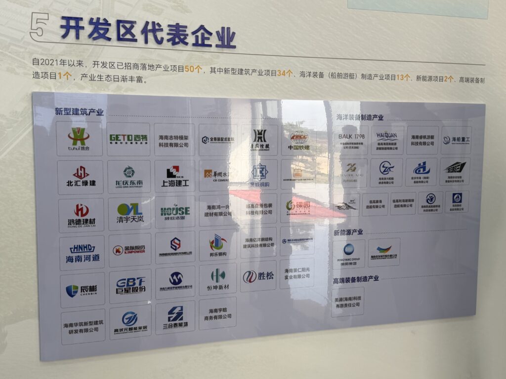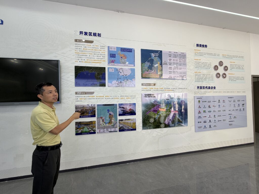 考察团一行在临高县县委常委雷宇等人的陪同下,先后实地走访了金牌港东港码头、康庄住工科技公司及临高海荃新能源游艇公司,详细了解港口建设规划、绿色建材及新能源游艇制造等产业发展情况。考察团成员对金牌港开发区的区位优势、产业布局及政策环境给予高度评价,并就相关领域合作展开现场交流。