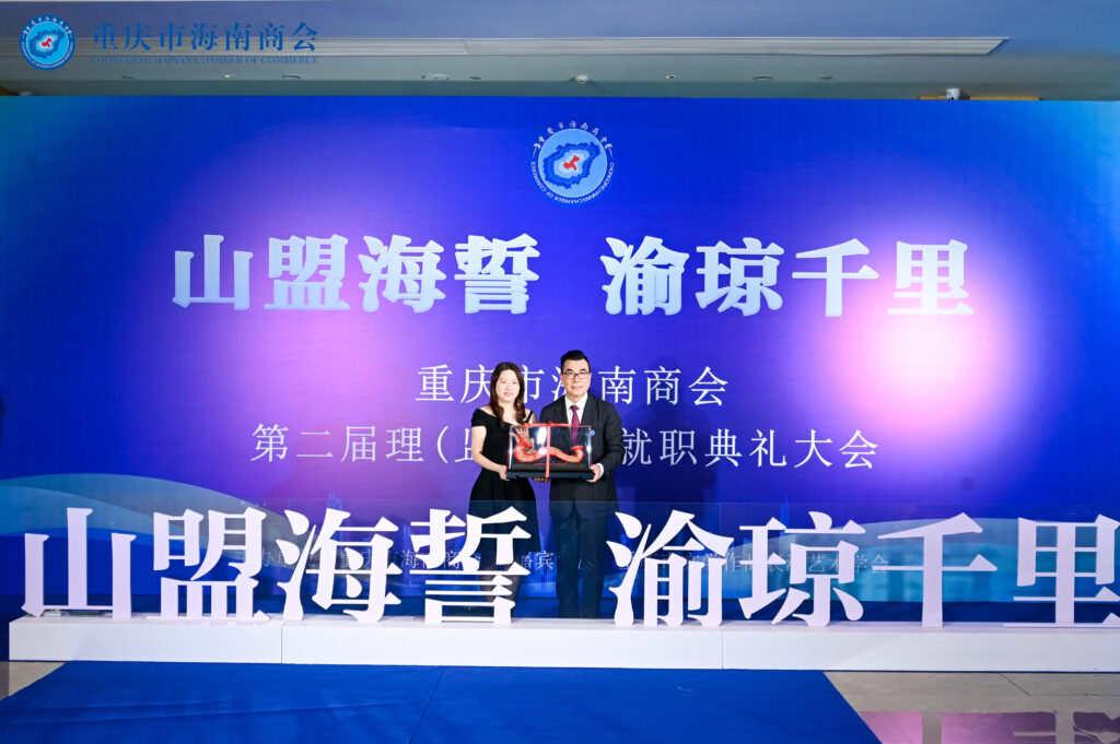 2025年5月26日,重庆市海南商会第二届理事会就职典礼在重庆隆重举行,我会李妍妍会长受邀出席此次活动并代表商会向重庆市海南商会赠送贺礼。